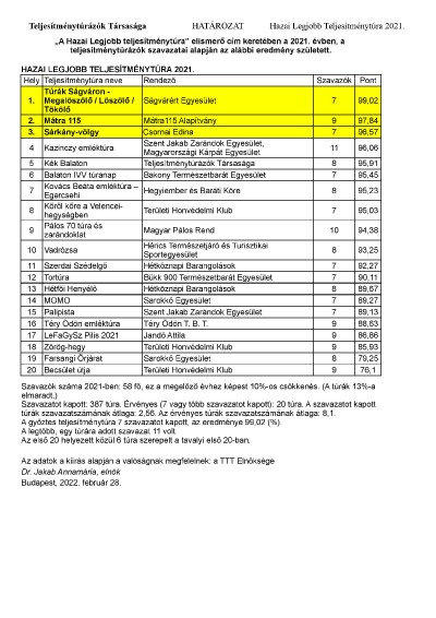 A "Hazai legjobb teljesítménytúra" elismerő címet nyerte el 2021-ben