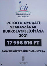 Projekt neve: Petőfi u. nyugati szakaszának burkolatfelújításaKedvezményezett neve: Ságvár Község ÖnkormányzataProjekt azonosító: 3292445825Támogatás összege: 17.996.916,-FtA támogatás mértéke: 100%
