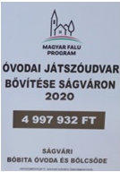 Projekt neve: Óvodai játszóudvar bővítése SágváronKedvezményezett neve: Ságvár Község ÖnkormányzataProjekt azonosító: 3019703991Támogatás összege: 4.997.932,-FtA támogatás mértéke: 100%